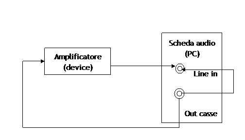(la figura 1 è commentata alla fine della descrizione) Veniamo ora a quello che ritengo essere l'argomento centrale e motivo primo d'essere di questo programma. Ossia la determinazione della risposta in frequenza di un qualsiasi device audio. Io mi sono divertito (si, per me è un divertimento!) a determinare la risposta in frequenza del mio amplificatore di casa (un vecchio Kenwood KA70) e, ancora più divertente, la risposta in frequenza del mio equalizzatore grafico. Ma procediamo con ordine. Innanzi tutto ecco lo schema ... hardware da usare: