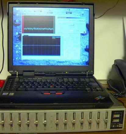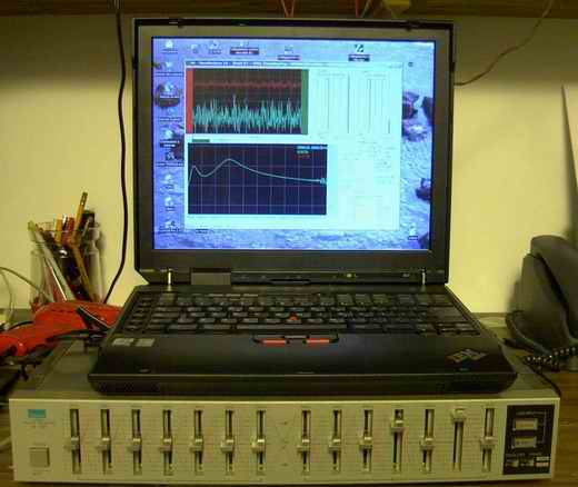 Utilizzando il metodo che usa l'opzione B-A o A-B la figura 1 mostra quello che ho ottenuto testando un vecchio equalizzatore grafico. Ho utilizzato il generatore di rumore bianco di VA, una semplice coppia di cavi ed il gioco è fatto. Nella fig. 1 si vede la curva di risposta in frequenza determinata con le posizione degli slide come in foto. A slide piatti avremo: