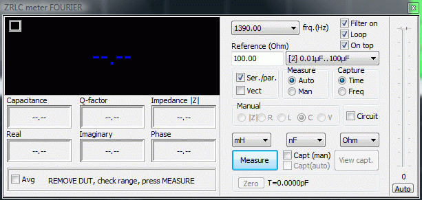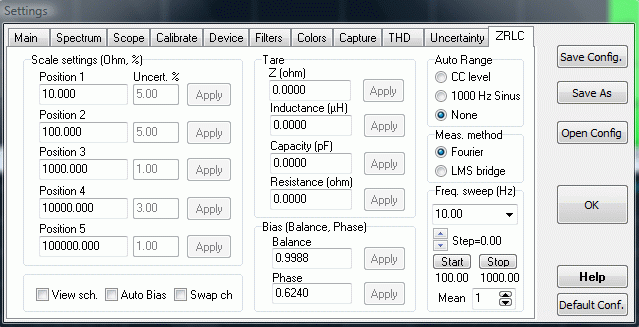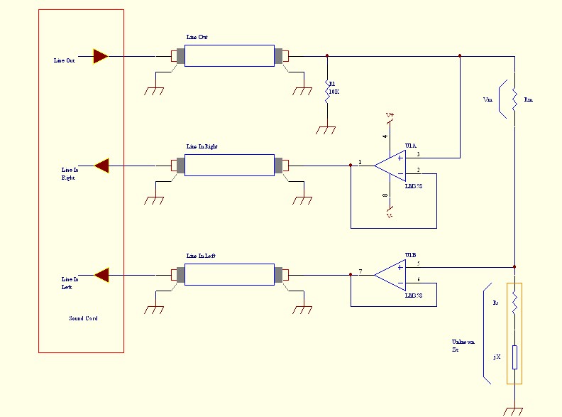 Ho lavorato a questa nuova funzione di VA per oltre un anno, e credo sia impossibile per i più comprendere l'incredibile quantità di lavoro che ha richiesto. Probabilmente, se avessi saputo in anticipo a cosa andavo incontro avrei quasi certamente desistito. In qualche modo, siamo giunti alla fine (o forse ad un nuovo inizio) ed io sono veramente orgoglioso del lavoro fatto. E' stata per me un'occasione di imparare molte nuove cose, ed in tanti settori diversi. La colpa di tutto è di Nuova Elettronica che, subdolamente, mi ha coinvolto in questa avventura! ZRLC è dotato di un numero consistente di opzioni, e per ora è impossibile spiegarle tutte; fortunatamente, sin dalla versione beta, il programma ha attirato l'attenzione di molti appassionati, ed in particolare di Massimo Marucchi, che ha dedicato ad esso ben due articoli con tanto di realizzazioni hardware. La rivista Nuova Elettronica, con la quale ho collaborato per l'intero inverno, mi ha fornito idee preziose ed è arrivata a scrivere un ottimo articolo su ZRLC ed a proporre un kit a basso costo da abbinare a ZRLC. Faccio notare che la mia collaborazione con Nuova Elettronica non è a scopo di lucro, nell'ottica di quanto più volte ribadito nel sito. In questa pagina darò solo le informazioni base, facendo notare che il programma comprende (o comprenderà) il calcolo delle cifre significative, dell'incertezza (compito arduo!), auto-determinazione dei livelli del segnale, un semplice "Vettorscopio", filtri interni, possibilità di eseguire sequenze automatiche di misura nel dominio del tempo e delle frequenza. E moltissimo altro. Siate pazienti se per ora sono un pochino "criptico" ma il tempo è veramente tiranno. Un piccolo preambolo. Per il corretto funzionamento di ZRLC è necessario costruire un semplicissimo hardware aggiuntivo, allo scopo di ottenere prestazioni non solo "hobbystiche". L'hardware necessario è, in prima battuta, una semplice coppia di amplificatori operazionali usati in configurazione "adattatori d'impedenza" allo scopo di elevare il più possibile l'impedenza d'ingresso del misuratore. Questo per uno scopo relativamente ovvio: una bassa impedenza d'ingresso, caratteristica tipica delle schede audio, significa una perturbazione non trascurabile nel valore dell'impedenza da misurare. Ossia, in altri termini, misure poco accurate. Ancora un ulteriore preambolo. Nel cominciare questo lavoro sono stato ispirato da lavori esistenti, quali quello del Dr. George Steber ed altri lavori similari pubblicati dalla rivista Elektor (Dr. Klaper). Più altri minori o ugualmente validi, almeno di cui io sia a conoscenza. In prima istanza ho semplicemente riprodotto i loro lavori, costruendo un misuratore d'impedenza basato sull'algoritmo LMS (Least Mean Square), ossia quello universalmente utilizzato dagli autori succitati. Successivamente, ritenendo insoddisfacenti i risultati ottenuti, ho sviluppato una versione personalizzata che sfrutta le collaudate routine sviluppate in anni di lavoro su VA (per esempio l' FFT) con l'aggiunta di un algoritmo proprietario per la riduzione consistente degli errori sistematici più significativi. I risultati delle misure sono stati eccellenti; ho effettuato un confronto diretto con strumenti professionali del costo di svariate migliaia di euro, e devo dire che sono rimasto letteralmente esterrefatto. Prima di tutto, mi preme dire che ZRLC è stato progettato nello spirito di evitare, almeno alla prima esecuzione, di confondere (e scoraggiare) l'utilizzatore a doversi occupare di un numero enorme di incomprensibili settaggi e procedure. L'idea sarebbe quella di 1) costruire il circuito e collegarlo al PC 2) far partire VA e fare la misura. Non è cosa semplice, data la natura delle misure; io ho cercato il più possibile di rendere tutto automatico. Fate partire VA; l'unico settaggio che sarebbe opportuno controllare ed eventualmente modificare sarebbe la coppia "frequenza di campionamento" e "dimensione del buffer". Allo stato attuale ZRLC è ottimizzato per funzionare al meglio con la coppia 40960 Hz e 4096 punti di buffer, che è il normale default di VA. Se lo avete modificato, vi consiglio di aprire la finestra di Settings ed modificare i valori a quelli suggeriti (sotto-finestra "Main" , sulla sinistra). Con questa scelta viene attivato un meccanismo di calibrazione automatica più sofisticato di quello normalmente utilizzato. In ogni caso se userete una coppia qualsiasi (es. 44100Hz, 4096 punti), per frequenze di misura inferiori a 3000 Hz i risultati saranno comunque ottimi. Vi ricordo infatti che la misura di una impedenza è fatta utilizzando dei segnali di test di tipo sinusoidale, e dunque caratterizzati da una frequenza; la teoria dice che - per esempio - l'induttanza o la capacità NON dovrebbero variare al variare della frequenza (al contrario di altri parametri), ma naturalmente nel mondo reale intervengono molti altri fattori che più misure fatte a varie frequenze di test possono evidenziare. Il valore di frequenza di test che VA sceglie come default è 1000 Hz. A questo punto, selezionate la CheckBox ZRLC, che trovate nella finestra principale di VA, nella lista di CheckBox sulla destra dell'analizzatore di spettro. Appare dunque la finestra di ZRLC (vedi sotto), che automaticamente modificherà tutti i restanti parametri di VA per il suo funzionamento ottimale.