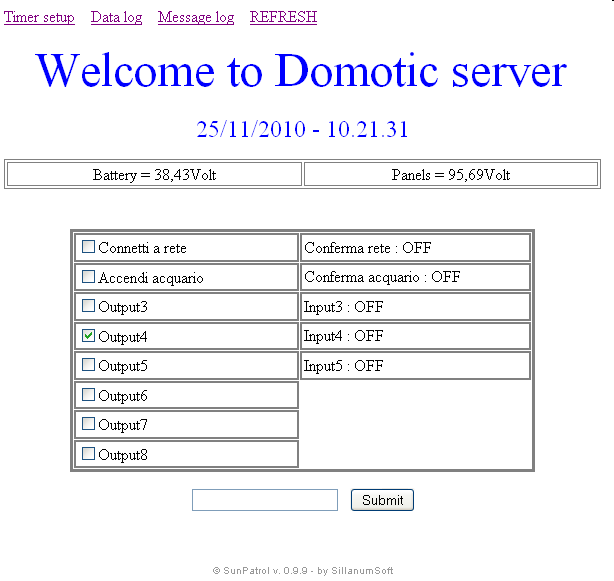 From this page you can manage the output and read the input; by clicking on the REFRESH option you can refresh the page, and so read the updated values. That in my case is the voltage of the photovoltaic panels and the state of charge of the battery. In my case I use the label "Welcome to Accattatis server", but you can use a personalized one.