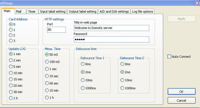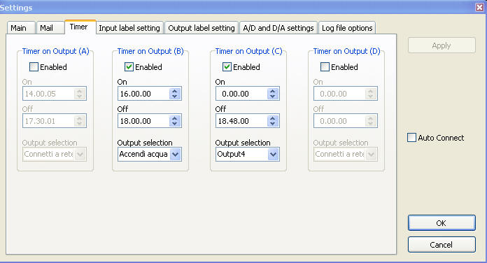 In fig. 3a you can set the address of the K8055 board, the refresh rate of the graphic log, the "sampling frequency" of the A/D converter plus the HTTP parameters (see next point). In window of fig. 3b you can set the parameters of the e-mail (as we will see in another section the program can send e-mails to notify "events" such as the switch of an input/output to on or off etc.). In fig. 3c you can set the values for the timer function, that is you can set four different timers, allowing to turn on/off one (or more) of the 8 available output (normally connected to a relay) at a predefined value of time.