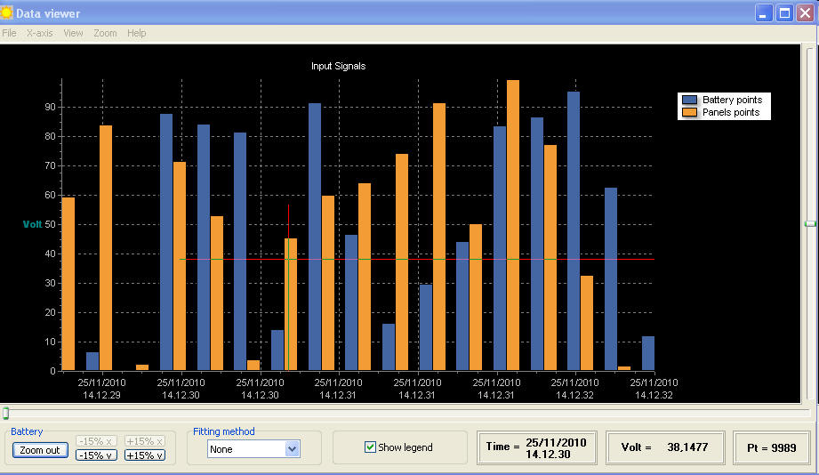 A further option allows to interpolate the raw acquired values, according to one of the method listed in the combobox "fitting method". Then, id desired, you can disable, by means of an option located in the menu of the main window, the visualization of the raw data (the bars) leaving only the interpolated graphic ("View" option). In any case Sunpatrol will save only the raw data.